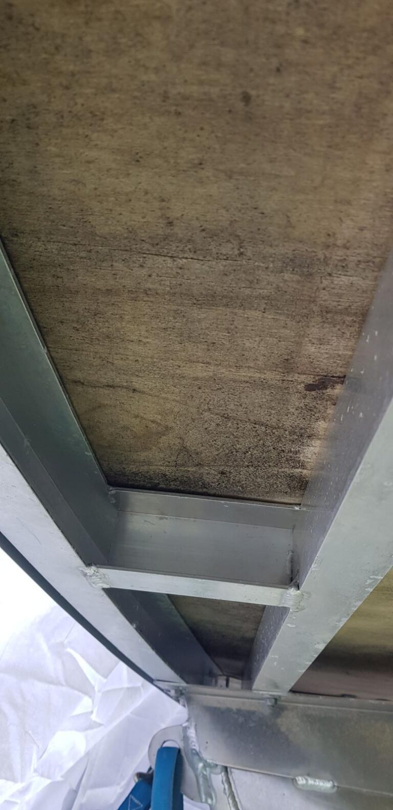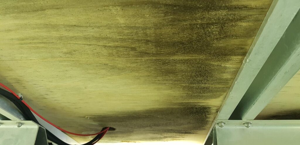 The lack of spacers between the flooring and the aluminum structure, combined with errors in the plywood sealing process, caused the plywood to start swelling. Mold growth is also visible.