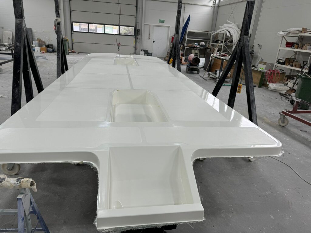 In DRIFTMARK pontoon boats from the AL series, we do not use plywood as flooring reinforcement. (Production photo below)